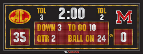 Un marcador matriz a todo color es ideal para instalaciones que entretienen a múltiples deportes. Ellos proporcionan una mayor flexibilidad y control dinámico de las estadísticas de juego, logotipos de los equipos, mensajes patrocinadores, gráficos y animaciones. Disponible en configuraciones de interior o al aire libre.